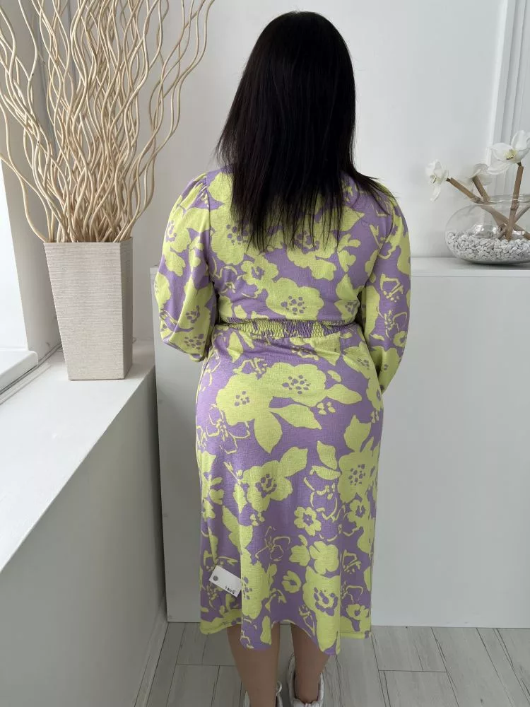 TU (M) Lila Neon Zöld Mintás, Derékban Darázsolt Gumis Ujjvégű, Kerek Nyakú Ruha