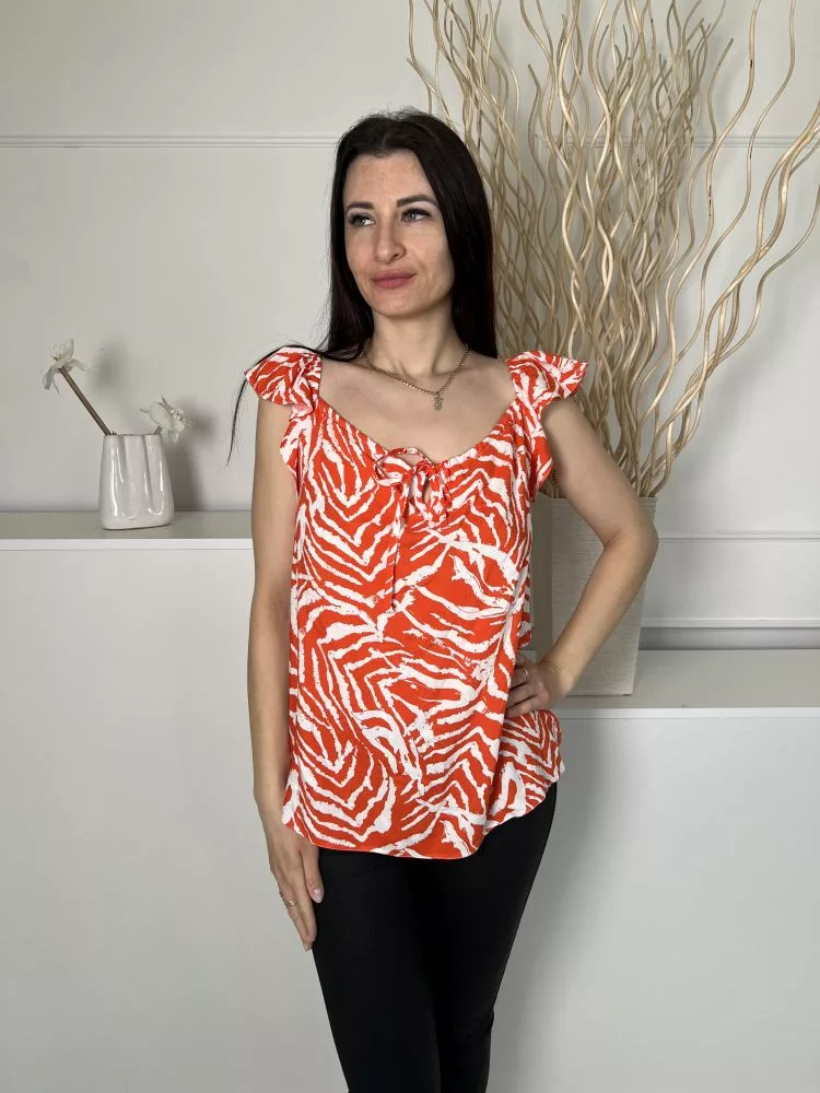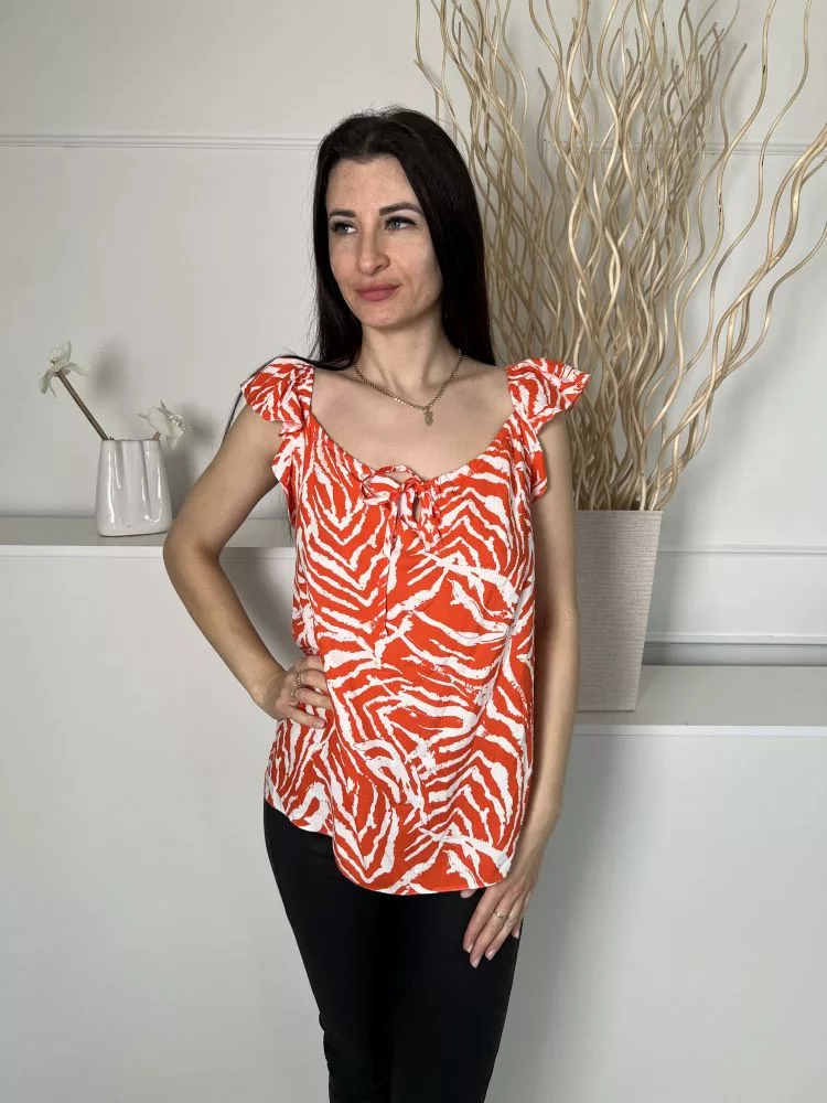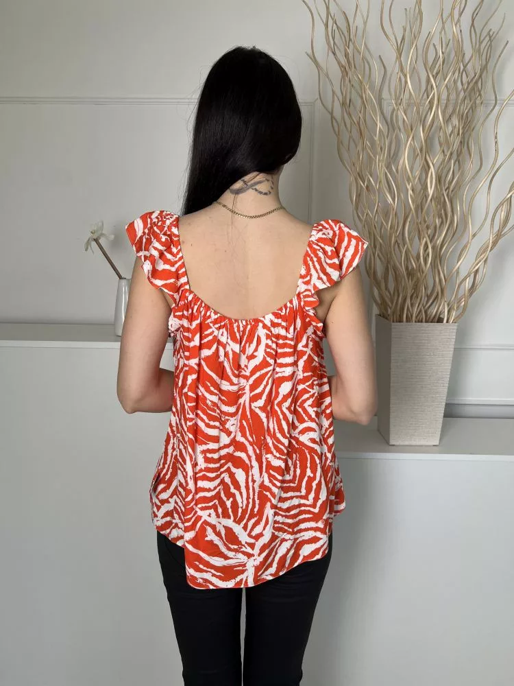 TU (M) Narancs Fehér Mintás, Fodros Vállú Mellnél Összehúzható, Megkötős Felső