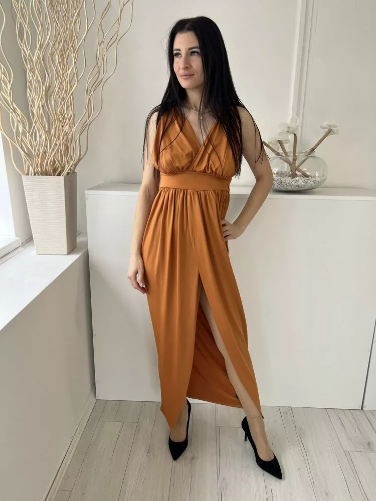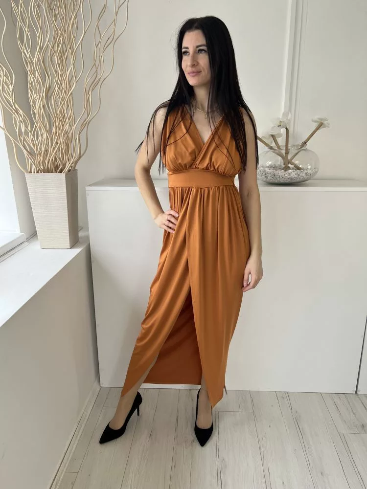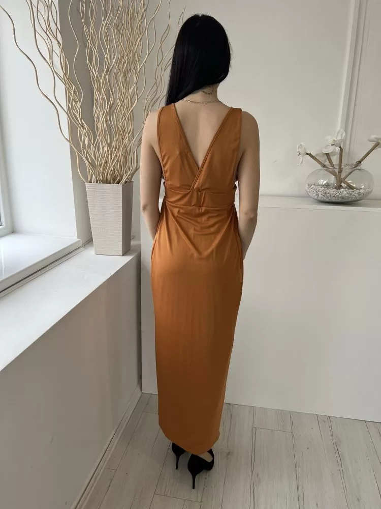 ÚJ Boohoo (XS) Aranybarna Mellnél Átlapolt, Derékban Szabott Elől Magasan Sliccelt Ruha