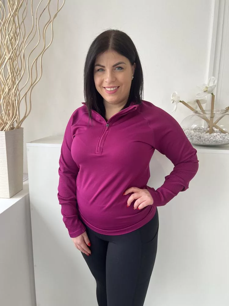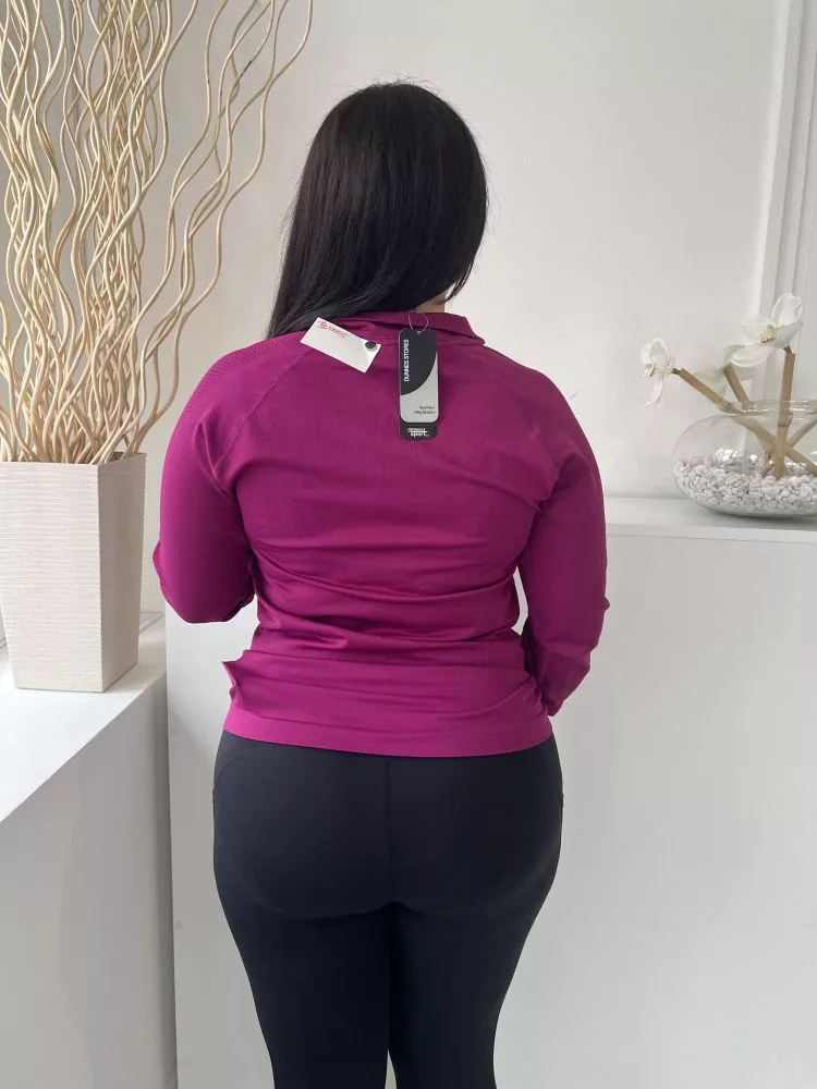 ÚJ Dunnes (L) Fukszia Mellnél Cipzáros Anyagában Mintás, Rugalmas Anyagú Felső
