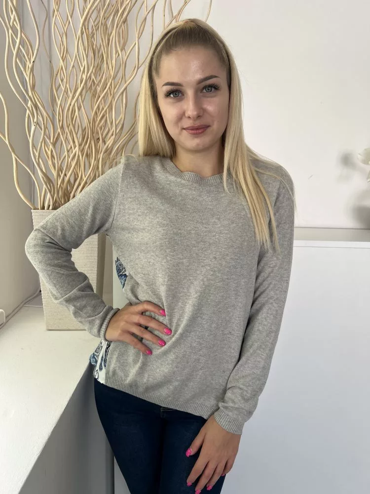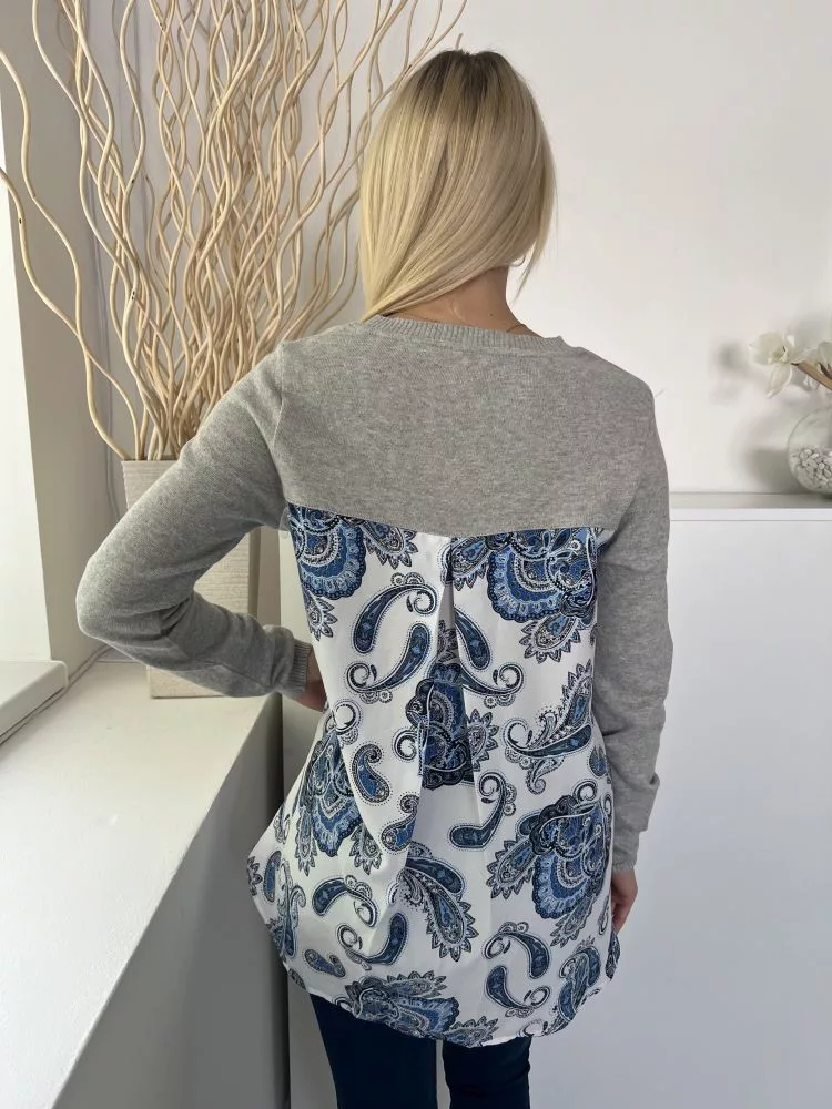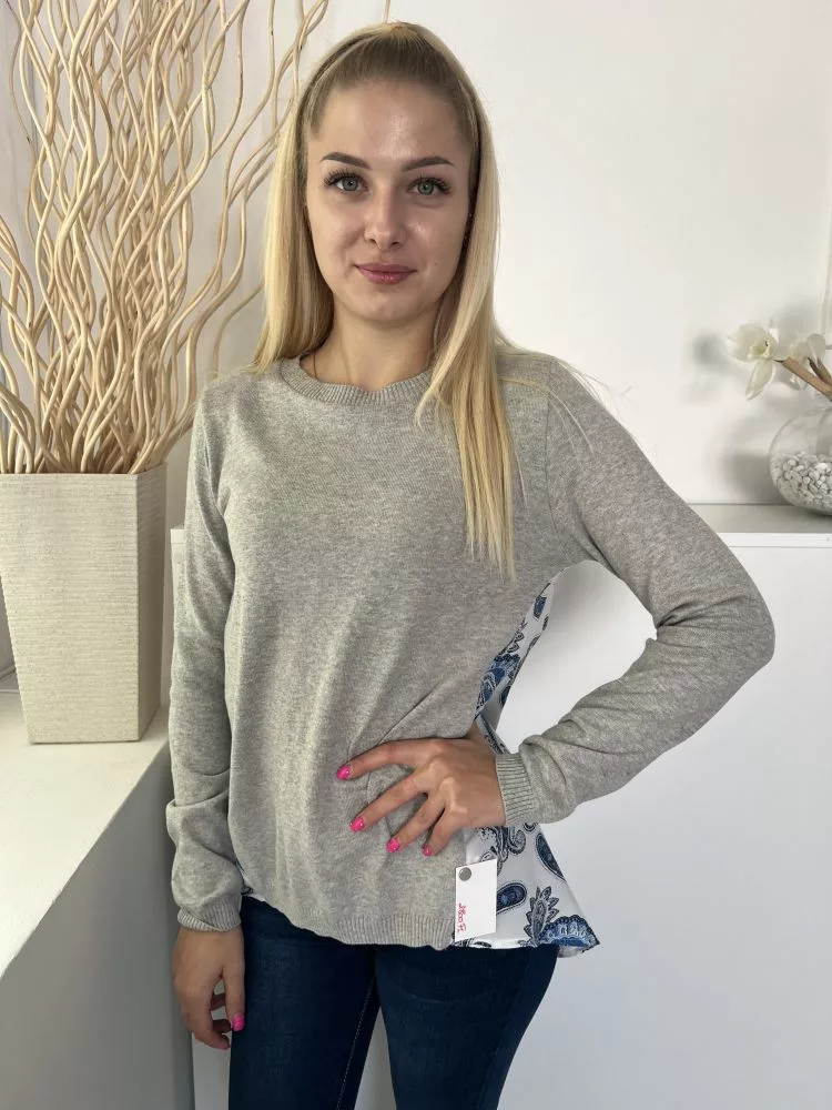 ÚJ George (M) Szürke-Kék-Fehér Hátul Ingbetétes, Kerek Nyakú Hátul Díszhajtásos Felső