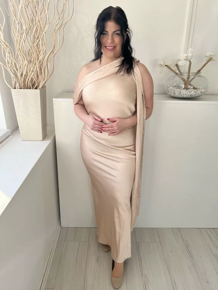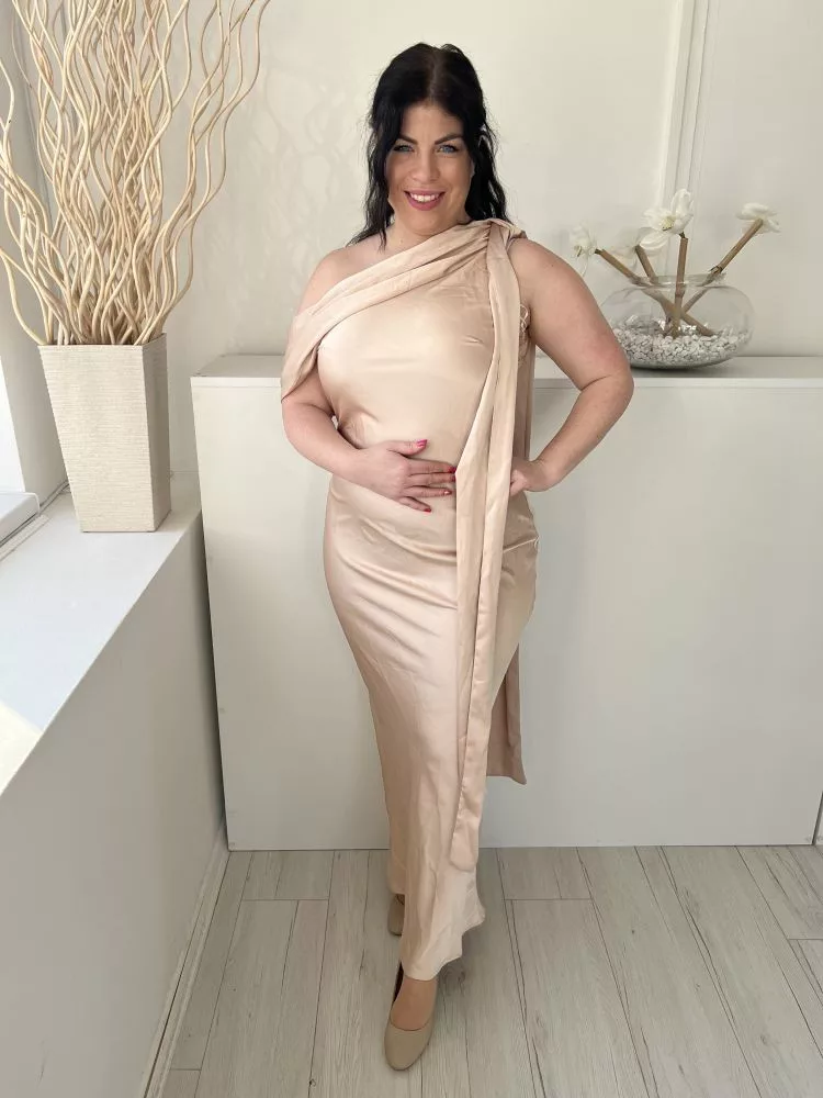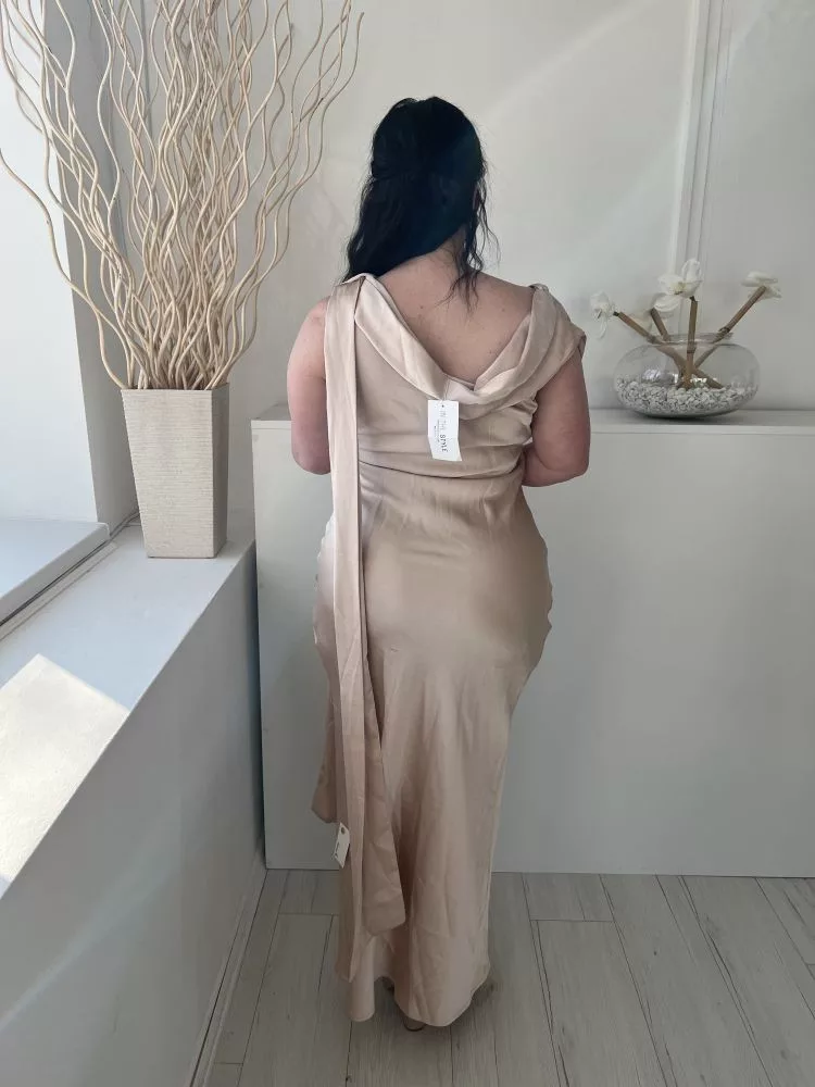 ÚJ In The Style (M) Púderszínú Oldalt Cipzáros, Vállán Díszmegkötős Fényes Anyagú Ruha