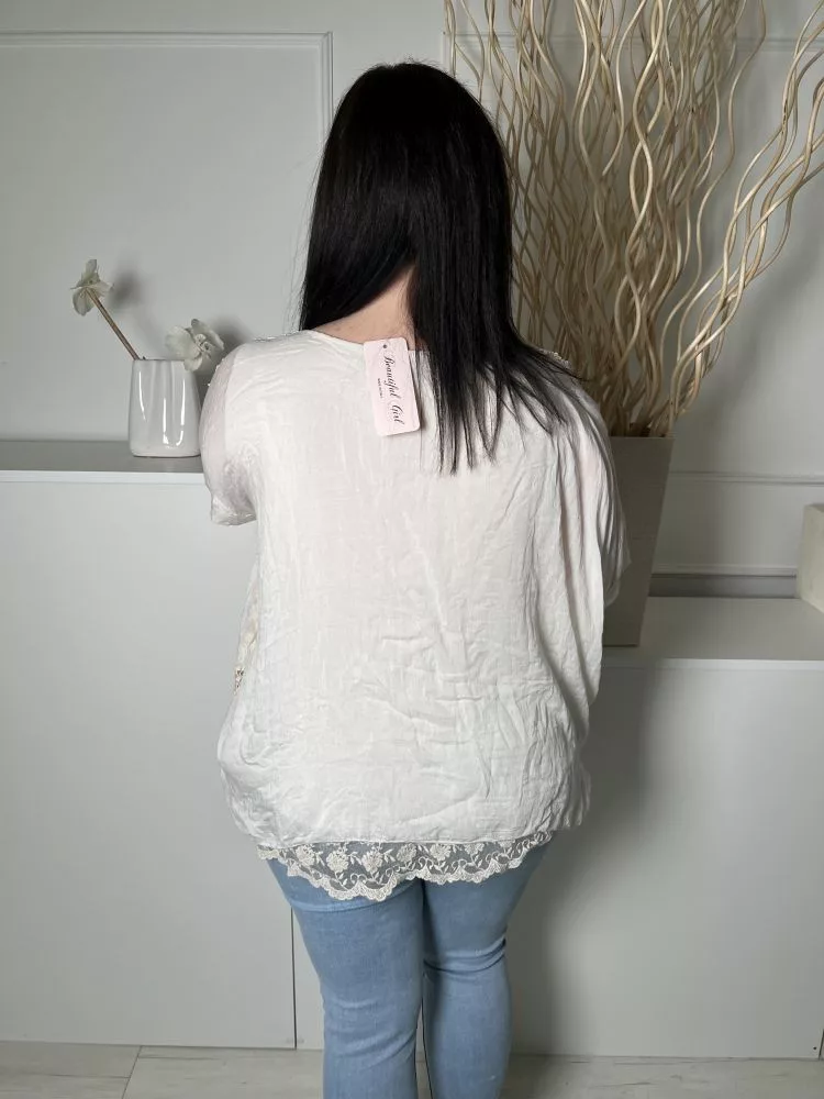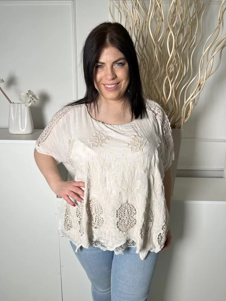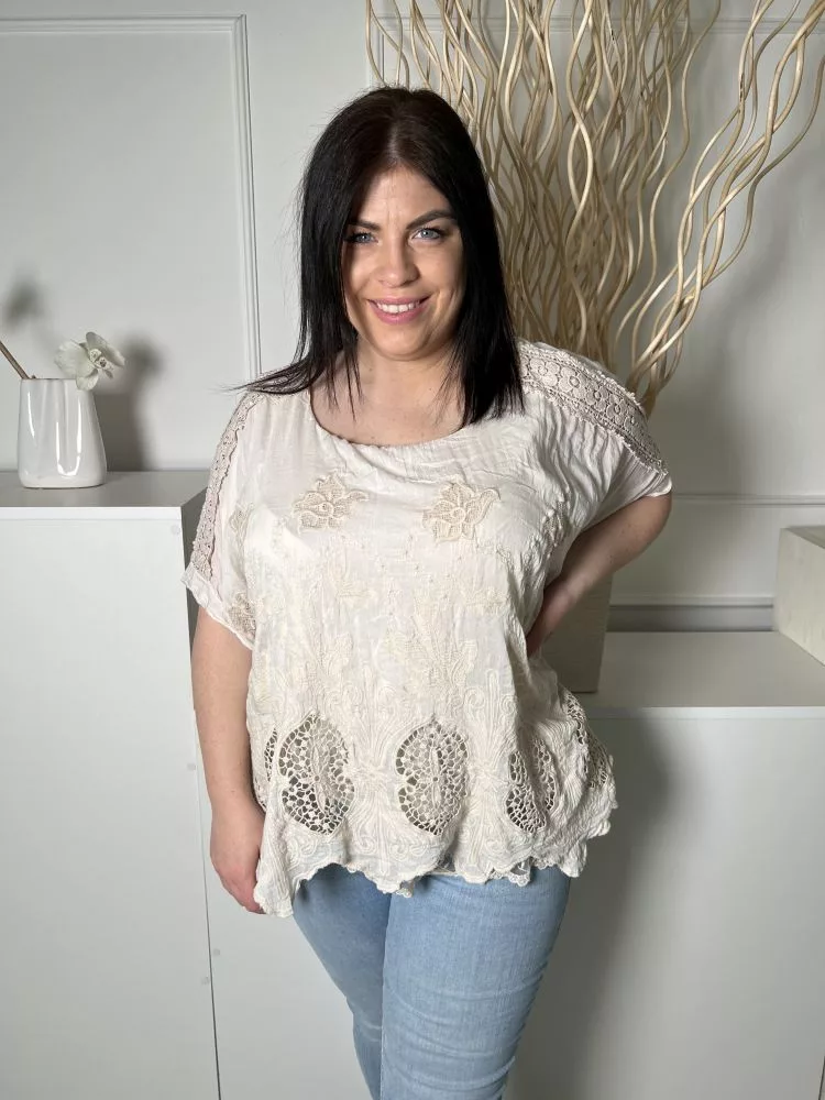 ÚJ (L) Drapp Anyagában Horgoltmintás Bélelt, Aszimmetrikus Aljú Felső