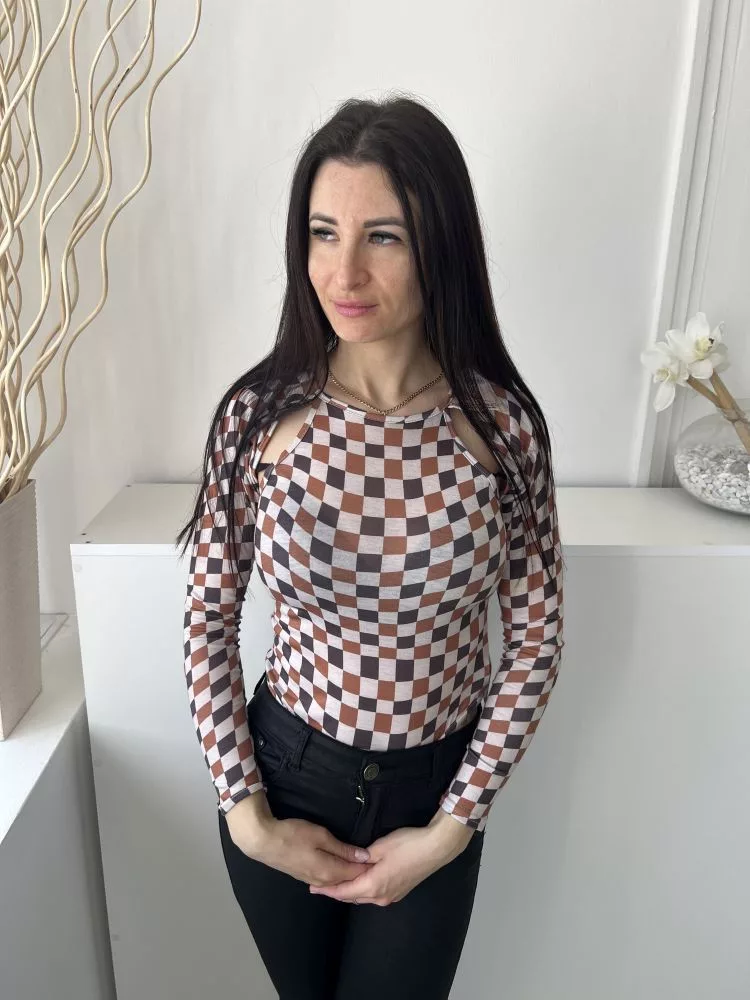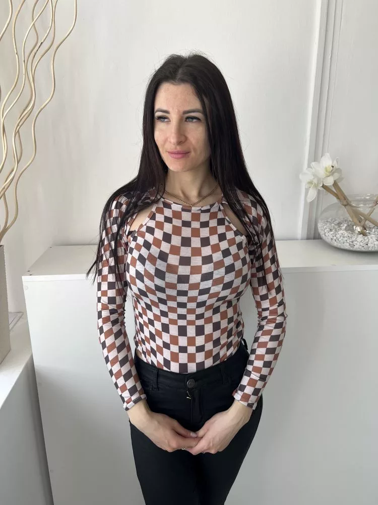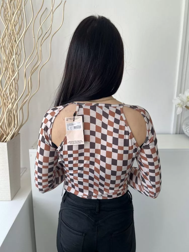 ÚJ Missguided (M) Fehér Barna-Fekete Kockás Mellnél Kivágott, Rugalmas Anyagú Body