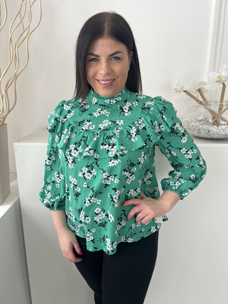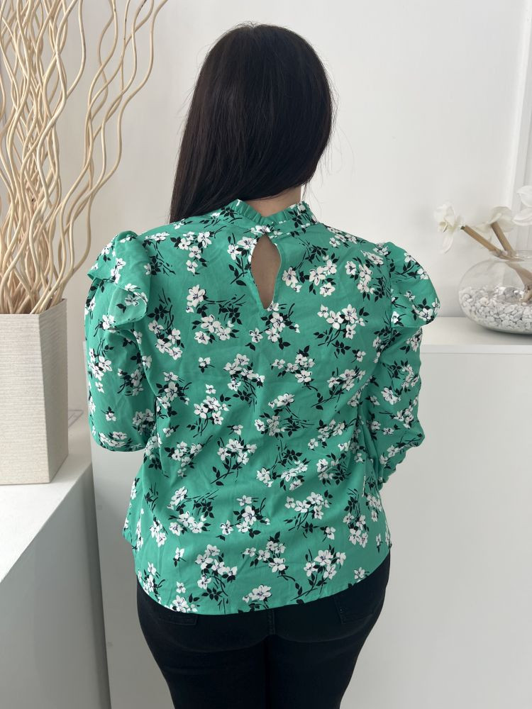 ÚJ New Look (M) Zöld Fehér Virágos, Hátul Nyakban Gombos Fodros Szegélyű, Gumis Ujjvégű Felső