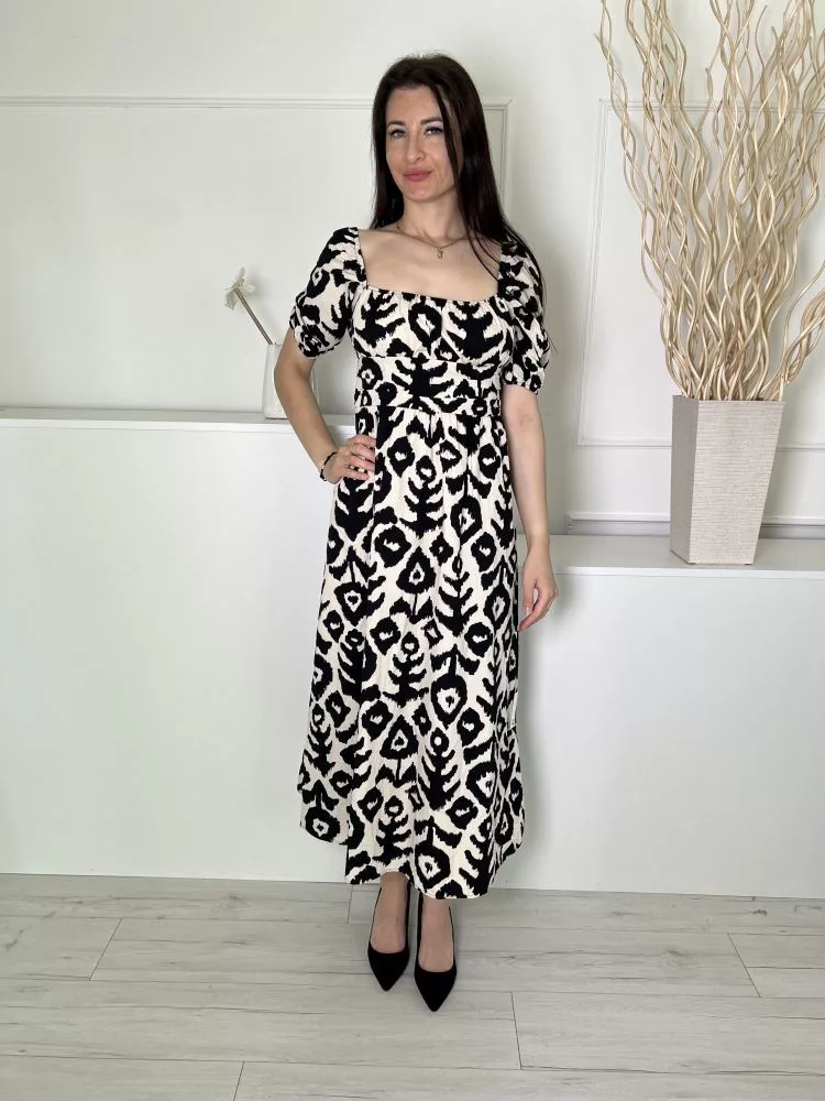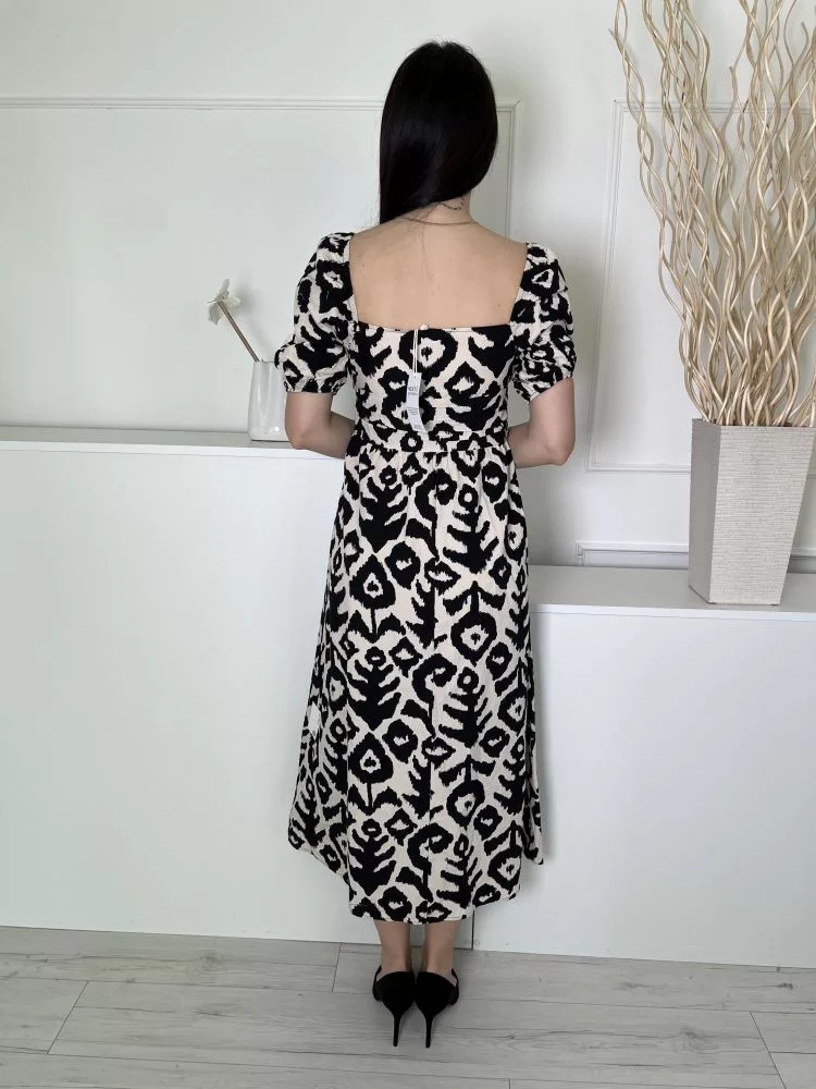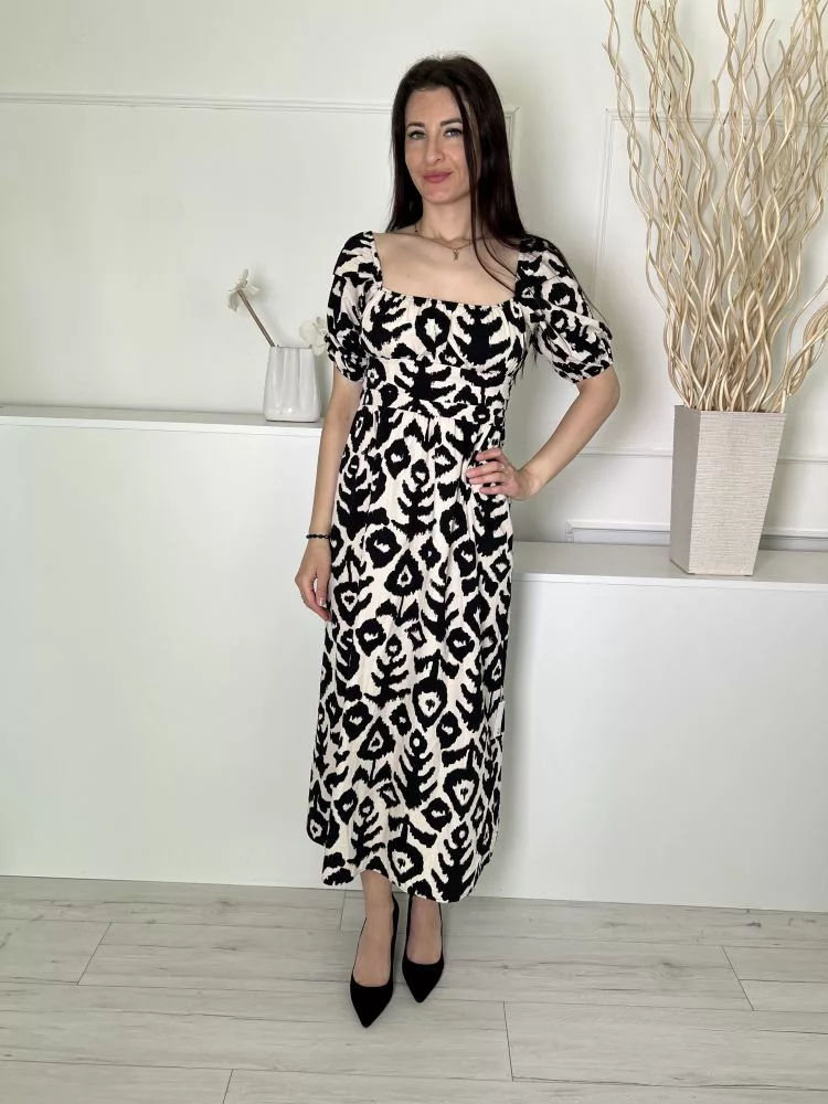ÚJ Next (S) Világos Drapp Fekete Mintás, Oldalt Cipzáros Kocka Kivágású, 100% Pamut Alapanyagú Ruha