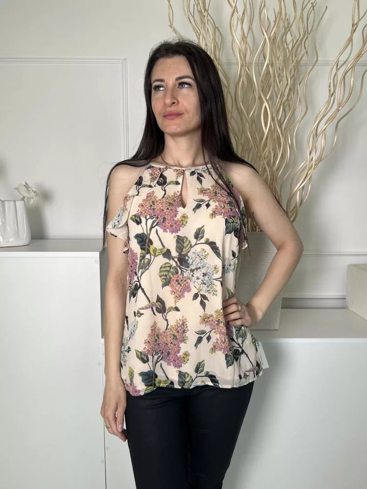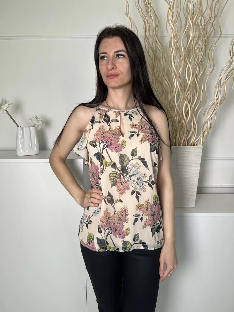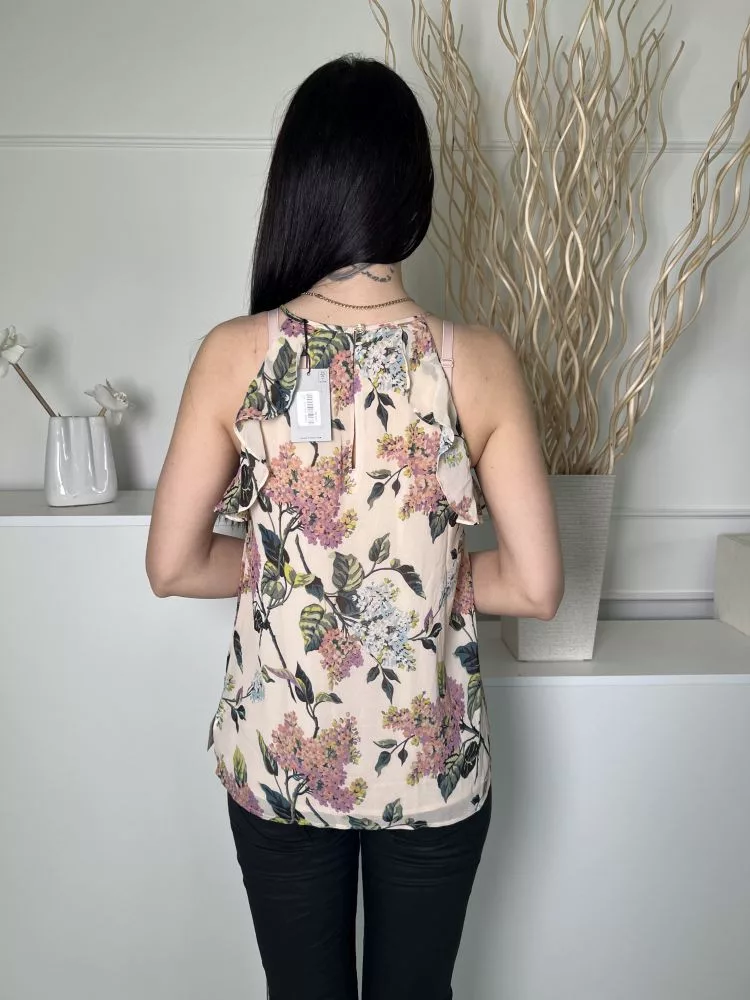 ÚJ Oasis (M) Világosbarna Színes Virágos, Hátul Nyakban Gombos Bélelt, Fodros Szegélyű Felső