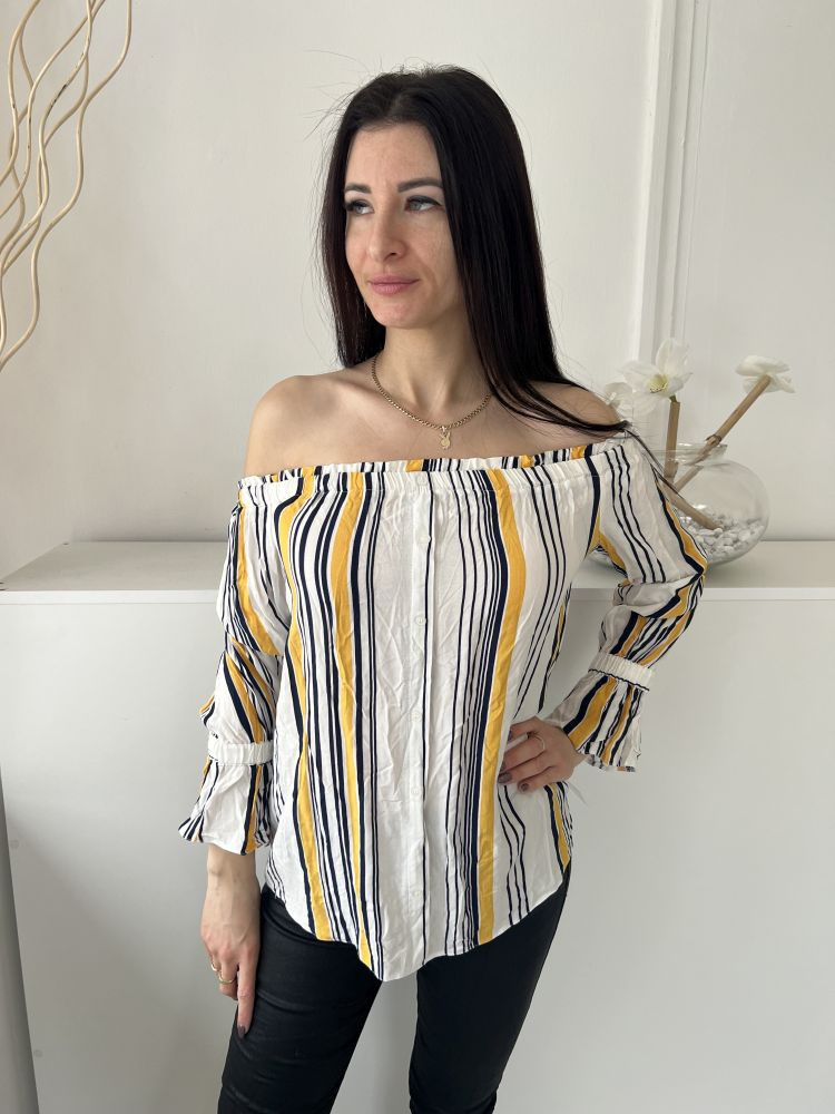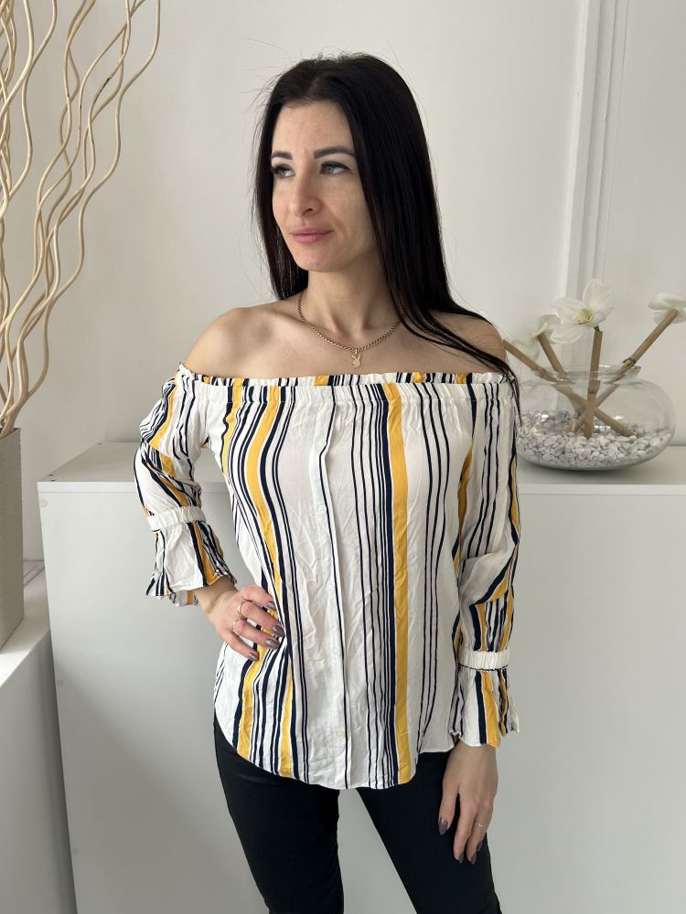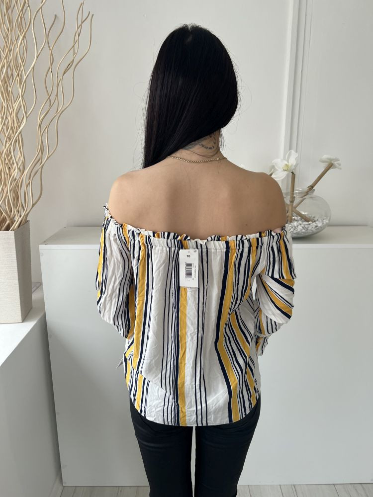 ÚJ Papaya (M) Fehér Sárga-Sötétkék Csíkos, Elől Díszgombos Ejtett Gumis Vállú, Tölcsér Ujjú Felső