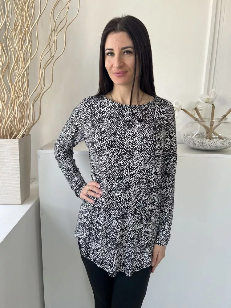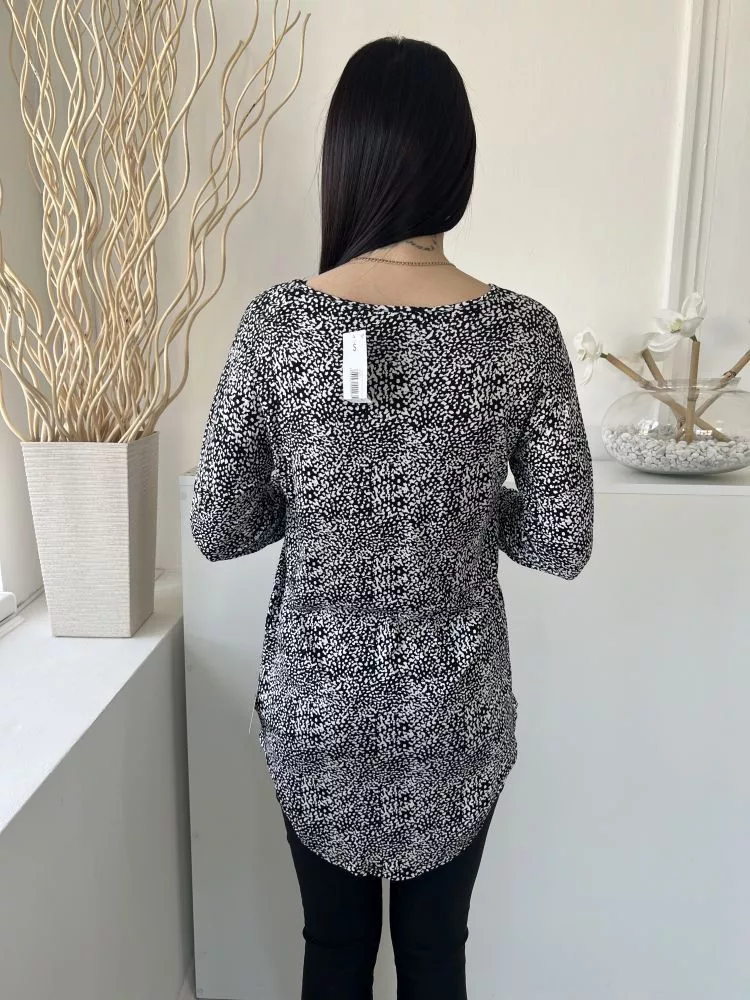 ÚJ Papaya (S) Fekete Fehér Foltmintás, Kerek Nyakú Hosszított Fazonú Felső