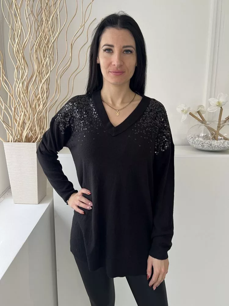 ÚJ Peacocks (M) Fekete Felül Csillogó Flitteres, V Kivágású Oldalt Sliccelt, Gépikötött Felső