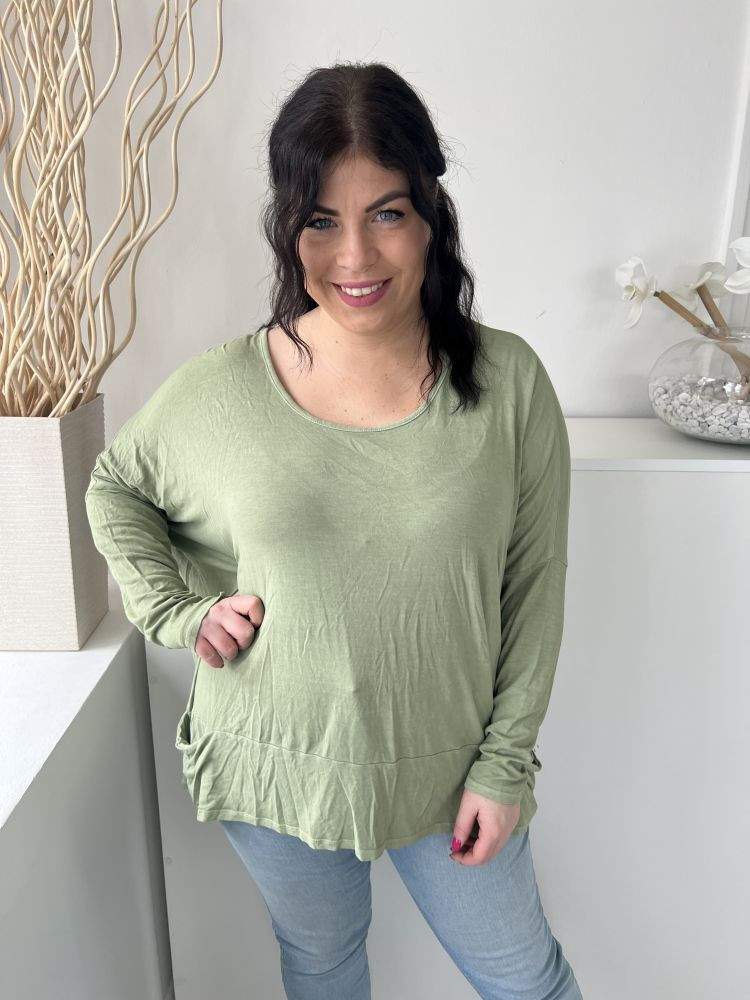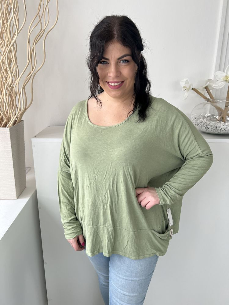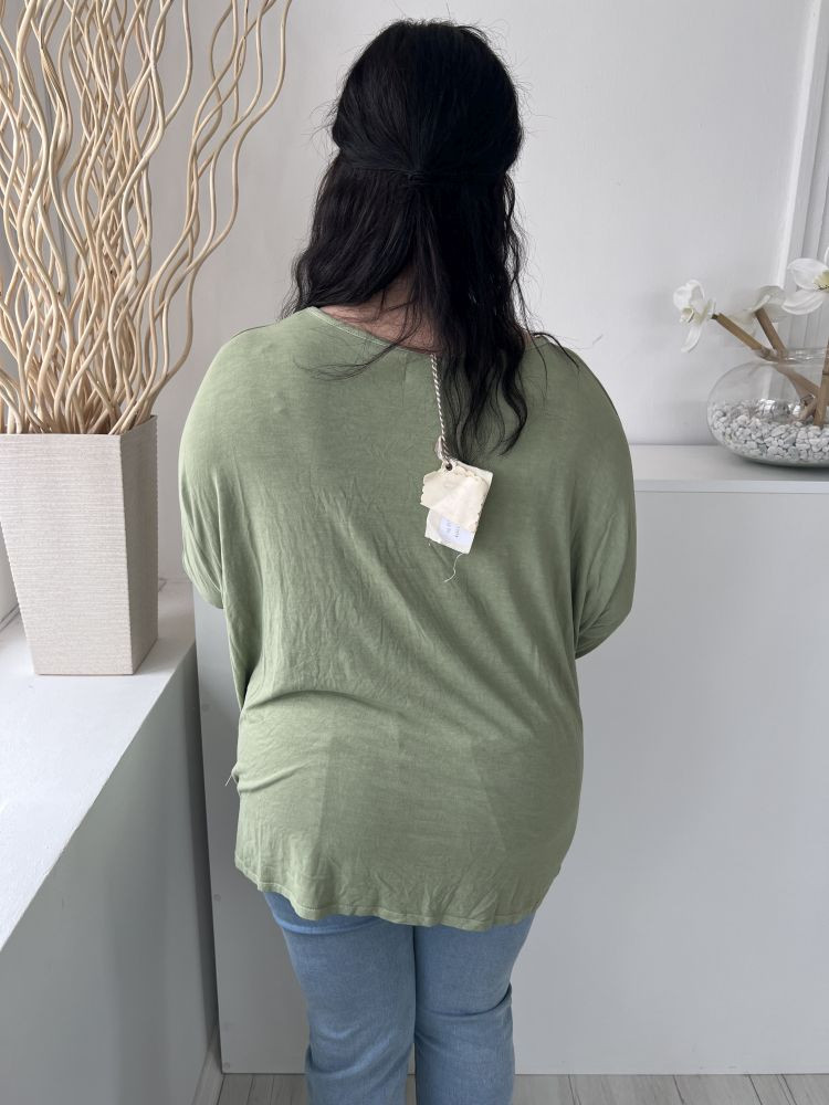 ÚJ Post Card (M) Permetzöld Kerek Nyakú, Zsebes Denevér Ujjú, Rugalmas Anyagú Felső