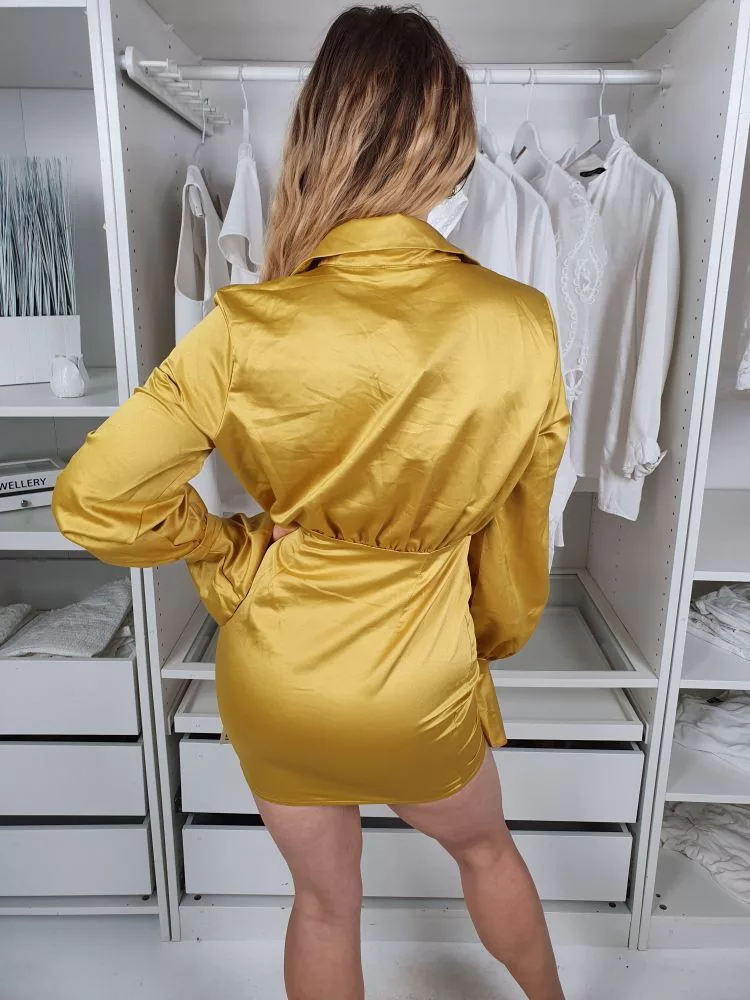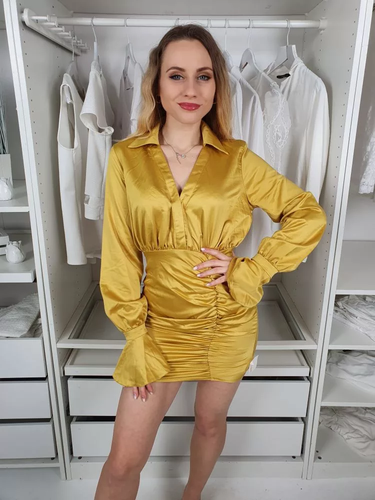 ÚJ Pretty Little Thing (M) Aranysárga Oldalt Cipzáros, Szoknyarészén Húzott Tölcsér Ujjú, Galléros Ruha