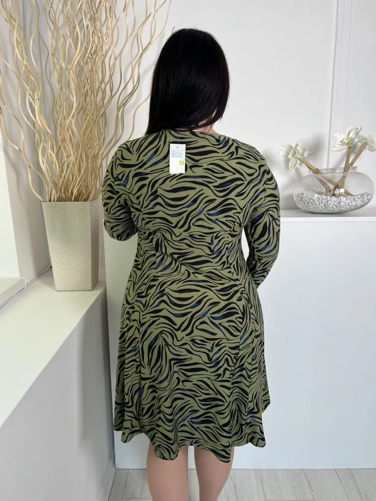 ÚJ Primark (M) Khaki Fekete Zebra Csíkos, Kellemes Anyagú Fodros Aljú, Kerek Nyakú Ruha