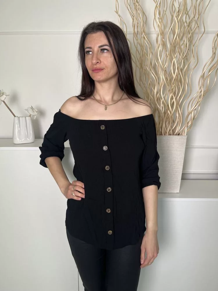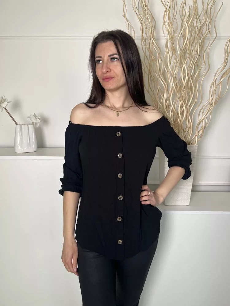 ÚJ Select (S) Fekete Elől Díszgombos, Ejtett Gumis Vállú Anyagában Mintás Felső