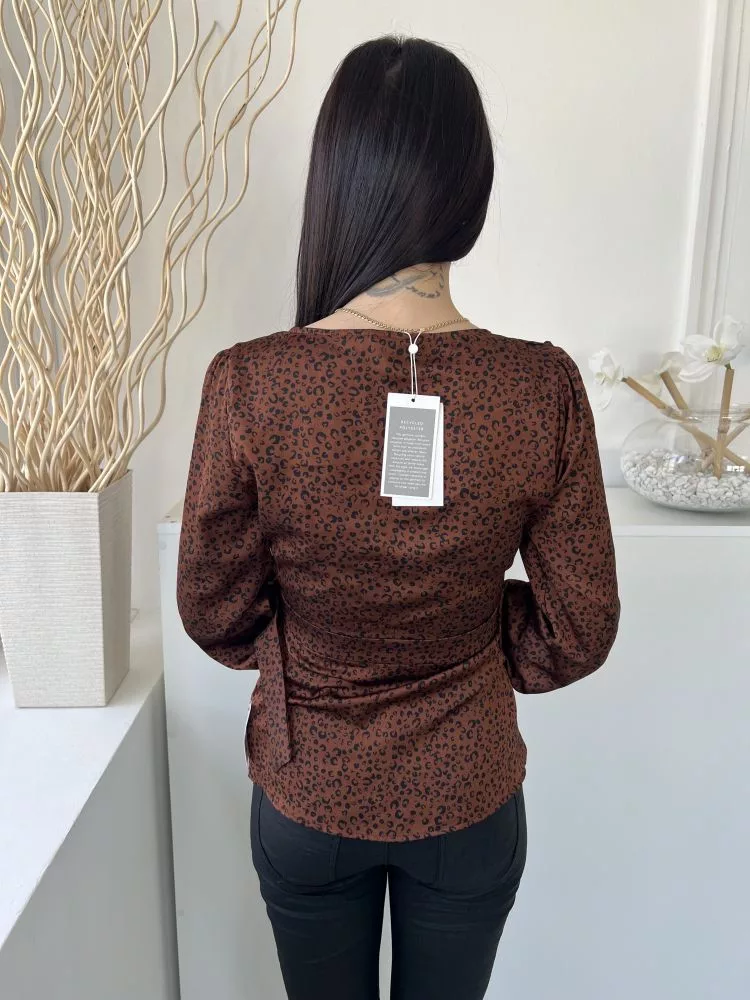 ÚJ Vila (S) Bronz Fekete Foltmintás, Átlapolt Oldalt Megkötős, Derékban Szabott Felső