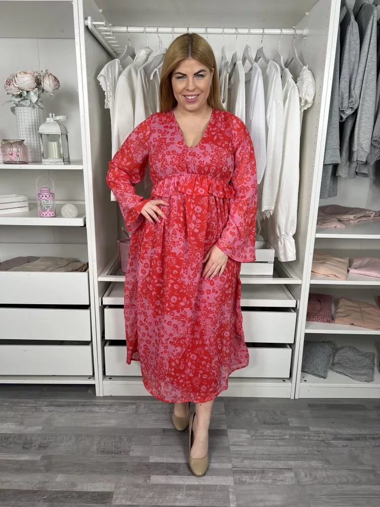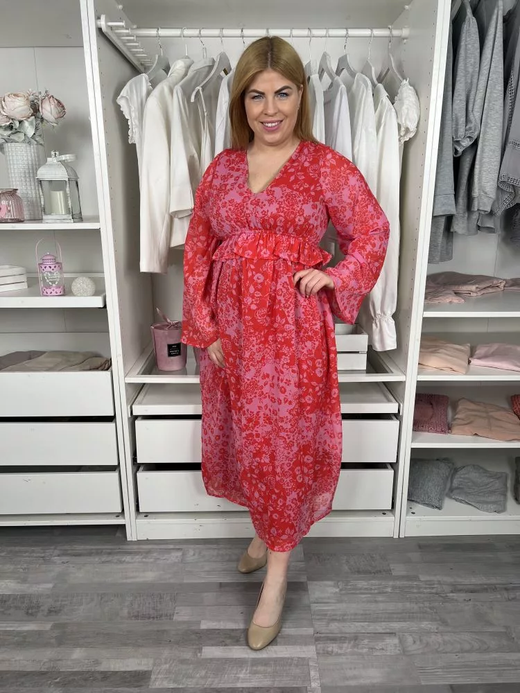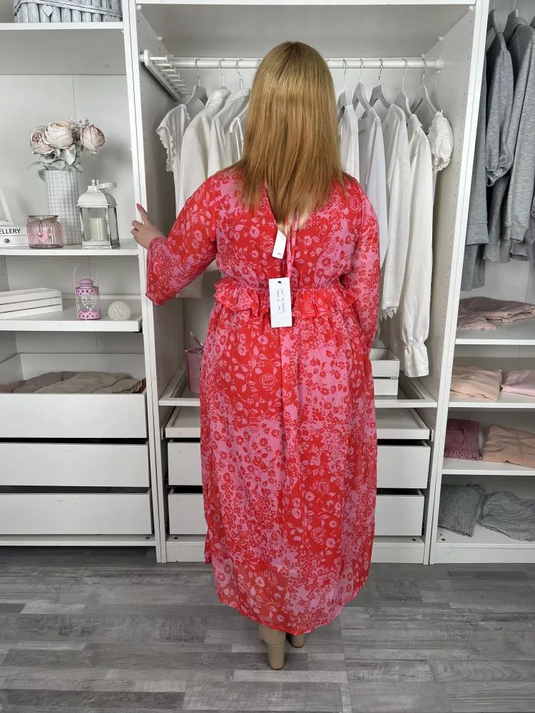 ÚJ Violet (M) Rózsaszín Piros Dupla Anyagú, Virágmintás Mell Alatt Gumis, Hátul Nyakban Megkötős Ruha