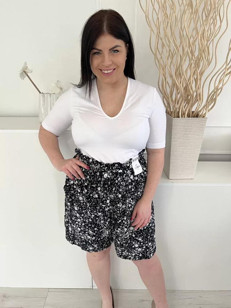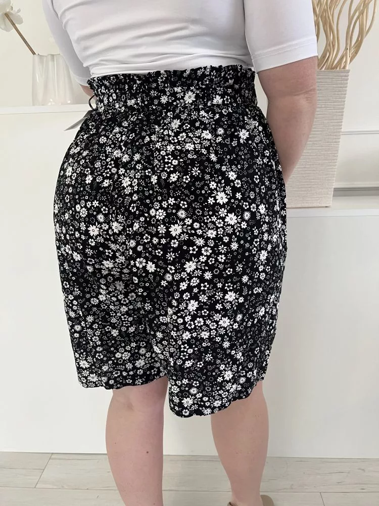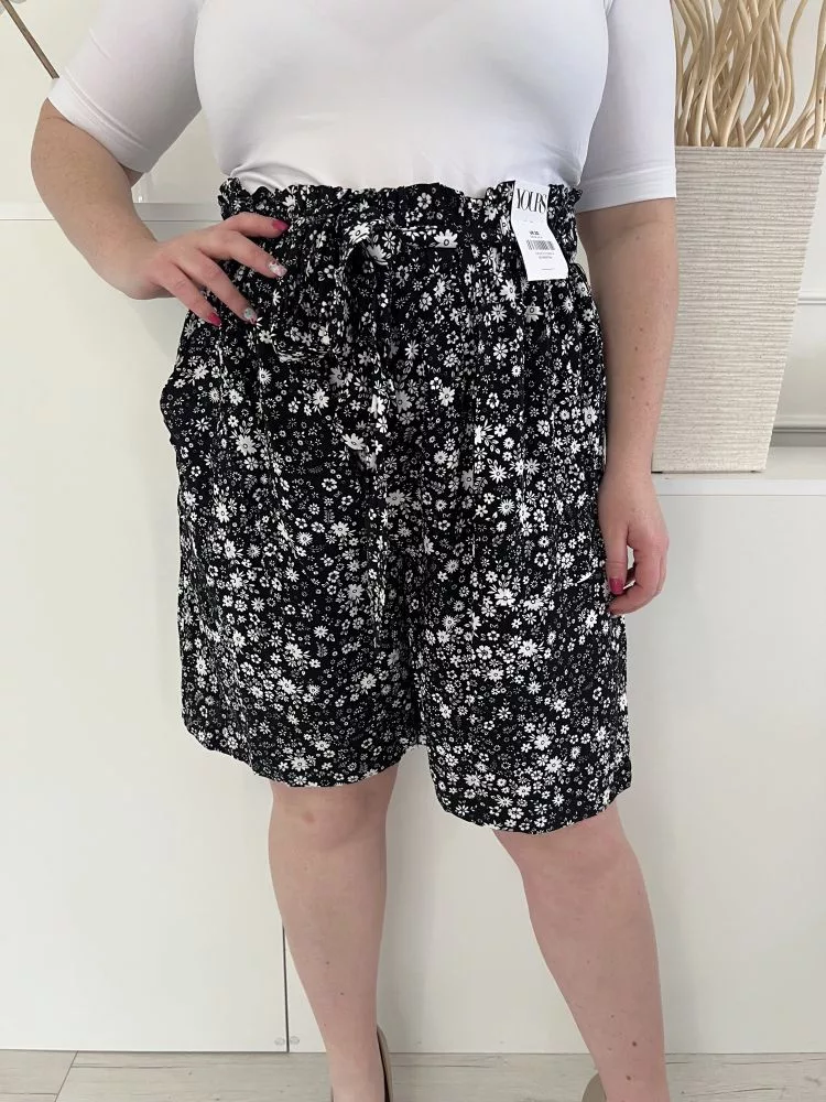 ÚJ Yours (XL) Fekete Apró Fehér Virágos, Gumisderekú Megkötős, Zsebes Rövidnadrág