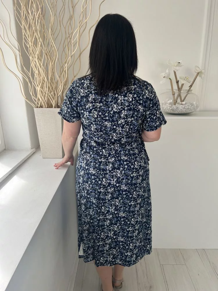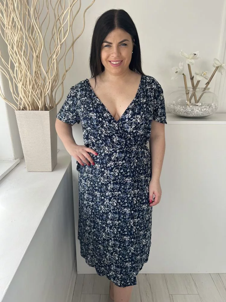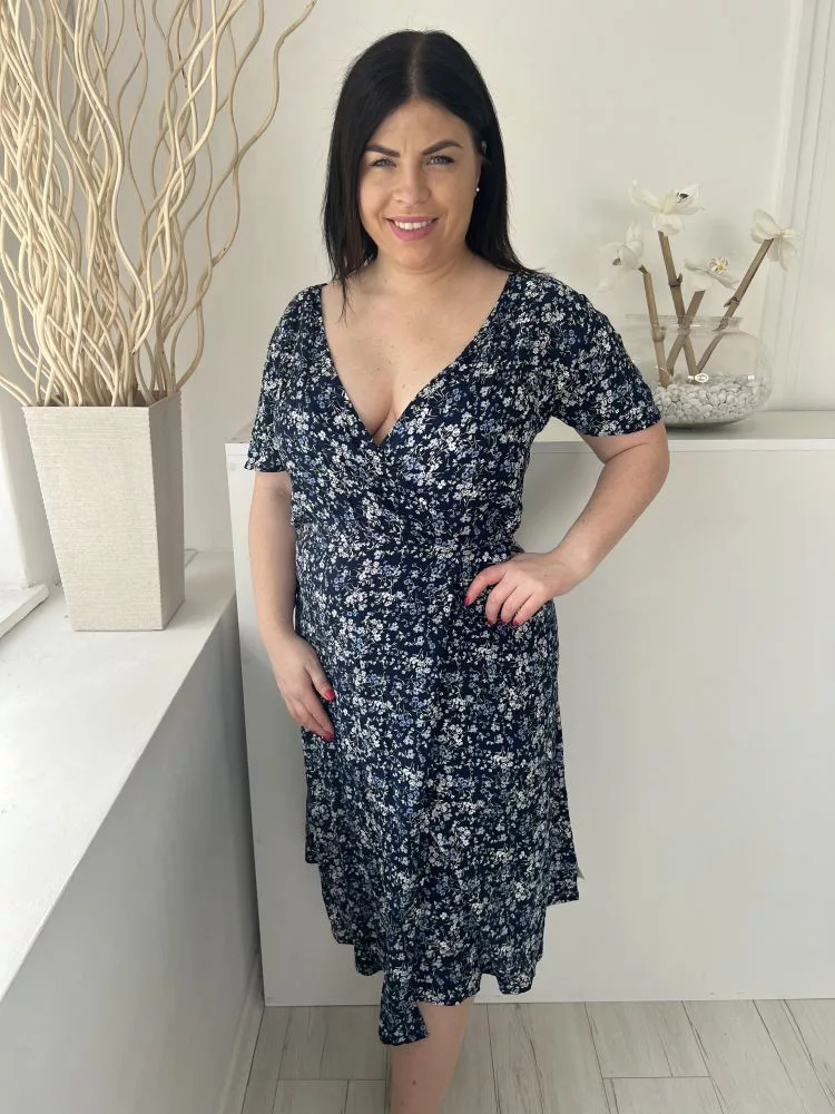 ÚJ ZARA (M) Sötétkék Apró Virágos, Átlapolt Oldalt Megkötős, Mély Kivágású Ruha