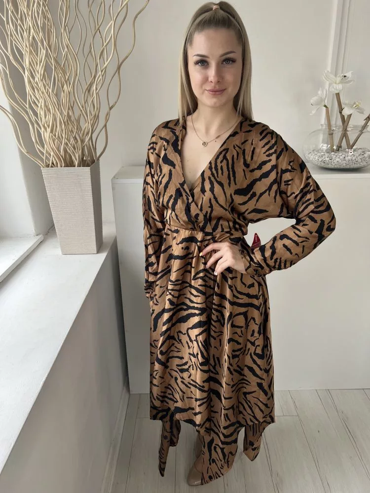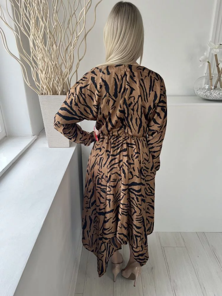 ÚJAX (M) Barna Fekete Tigriscsíkos, Hátul Cipzáros Mellnél Átlapolt, aszimmetrikus Aljú Ruha