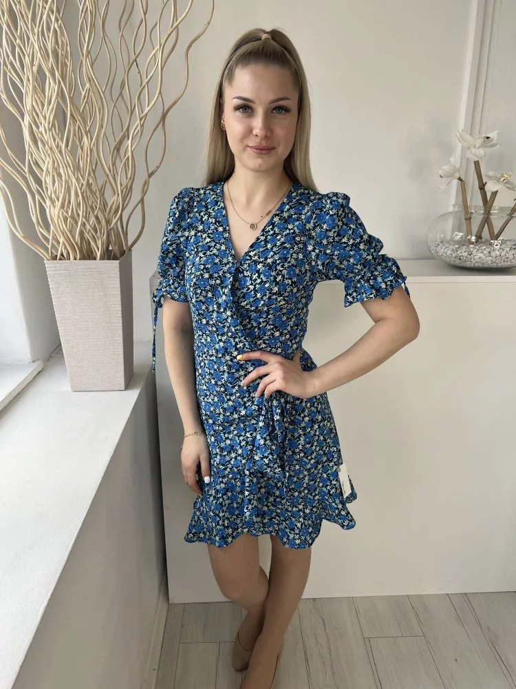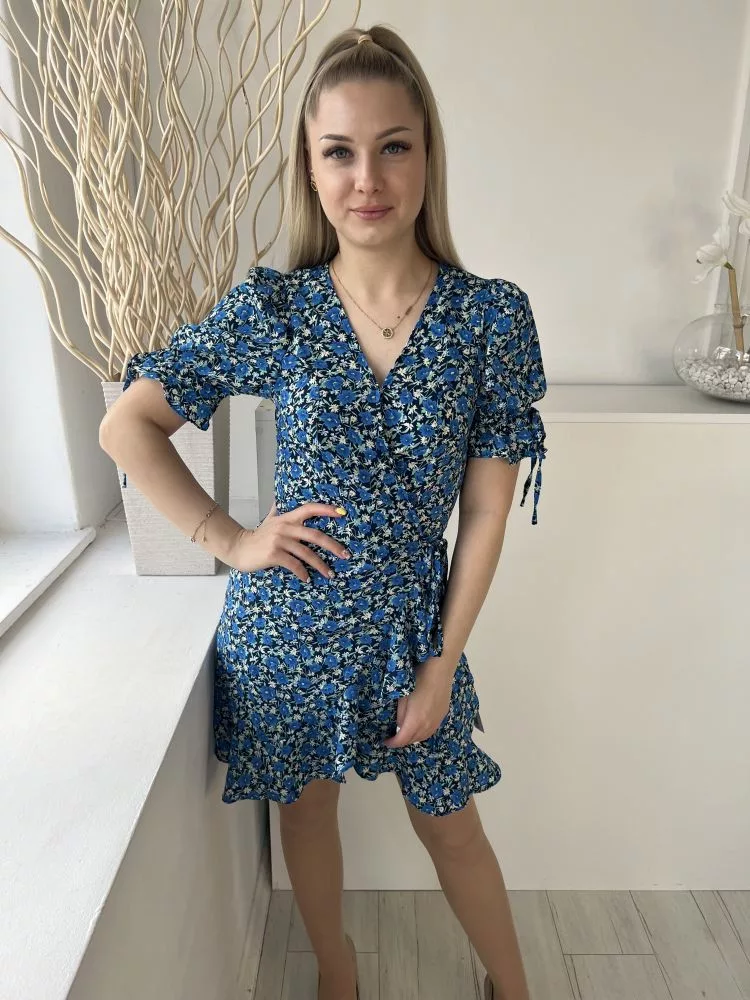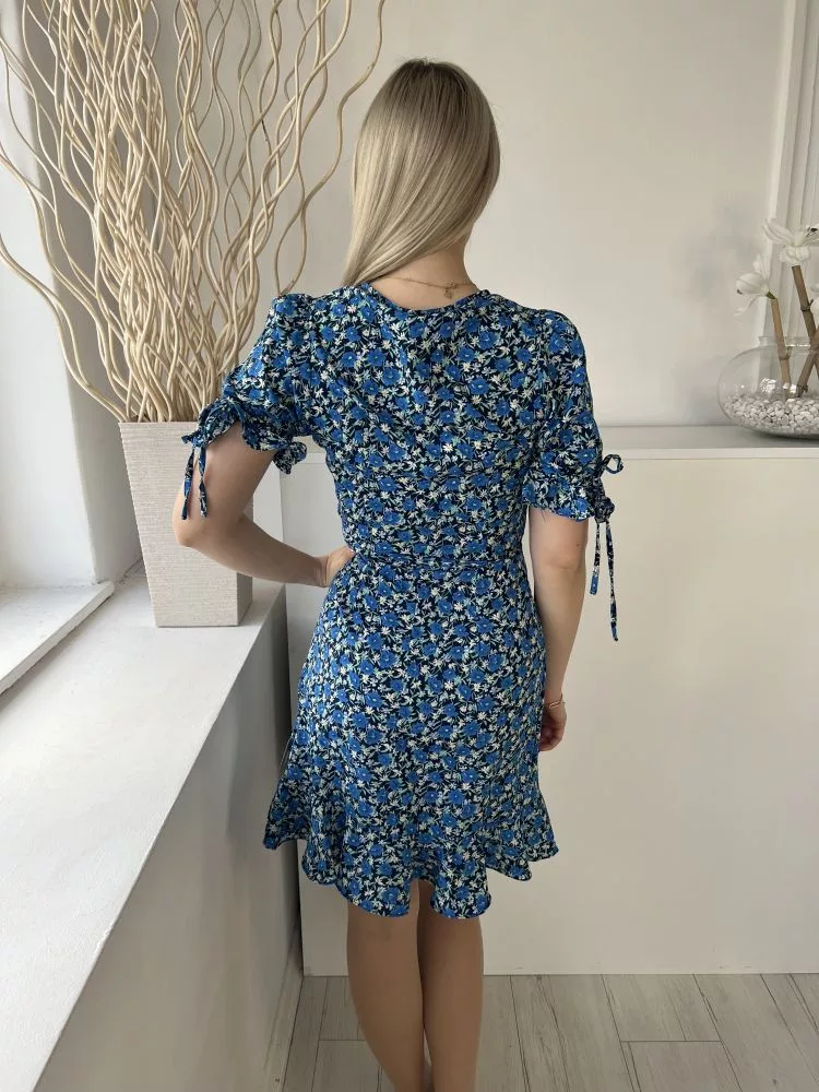 ÚJBrave Soul (XS) Sötétkék Kék Sűrű Virágos, Átlapolt Oldalt Megkötős, Fodros Szegélyű Ruha