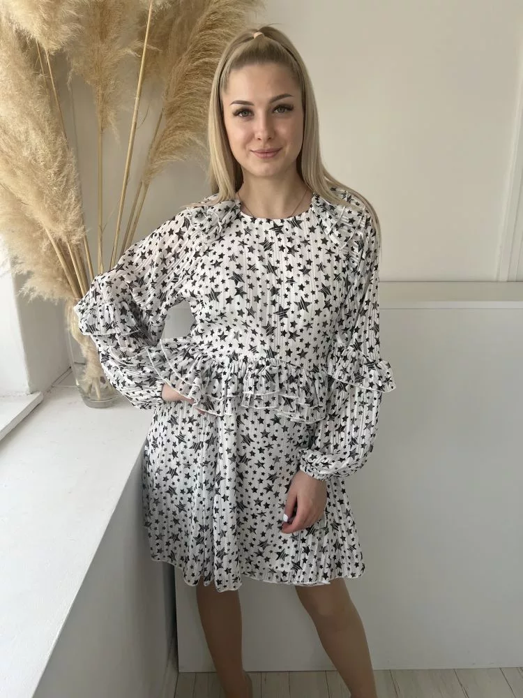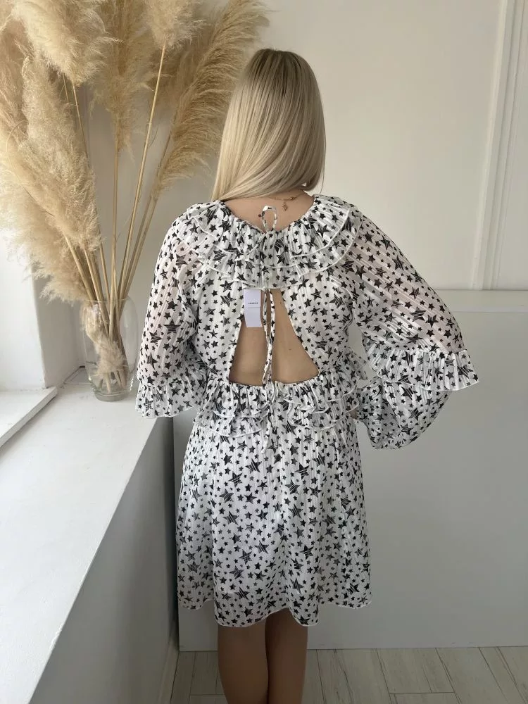 ÚJTopShop (M) Fehér Fekete Csillagmintás, Hátul Cipzáros Fodros, Hátul Nyakban Megkötős, Nyitott Hátú Ruha