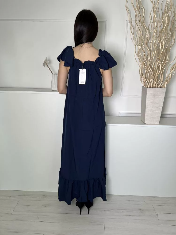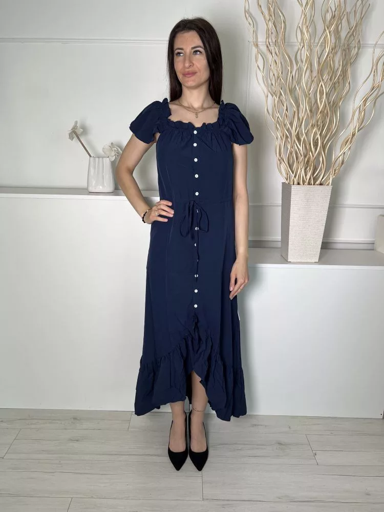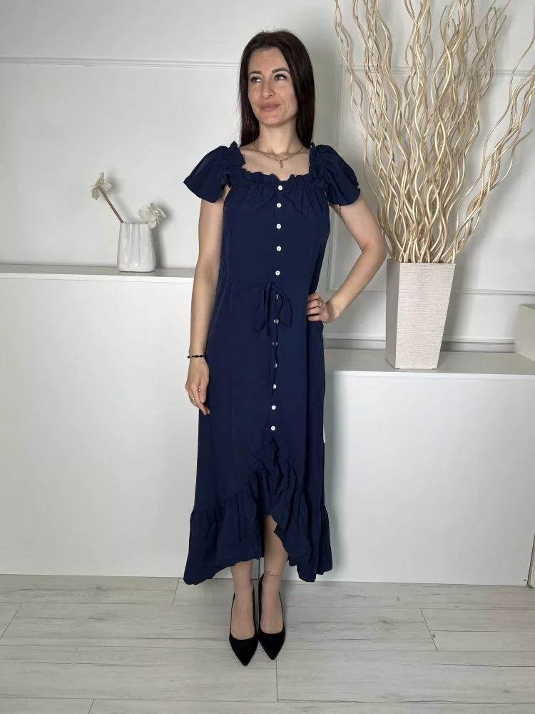 Új Yidarton (S) Sötétkék ELŐL Végig Gombos, Derékban Megkötős Fodros Aljú Ruha