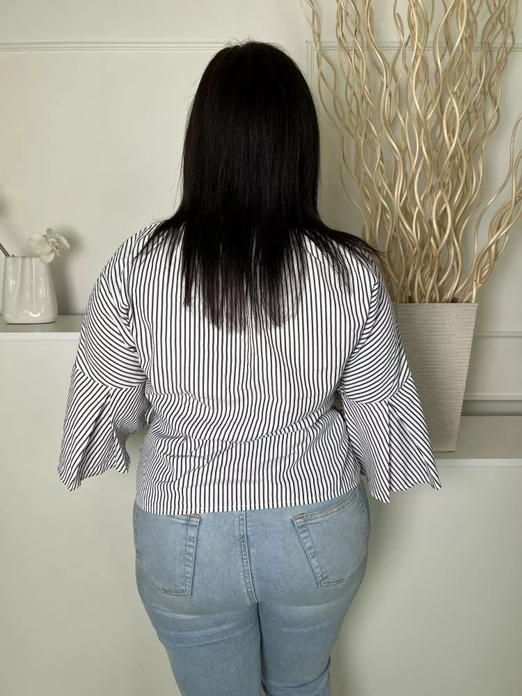 Urban Mist (L) Fehér Fekete Csíkos, Mellnél Átlapolt Derékban Megkötős, Tölcsér Ujjú, 80% Pamut Felső