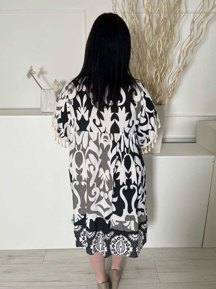 (XL) Fehér Fekete-Szürke Mintás, Nyakban Megköthető Ujján Horgolt Díszes Ruha