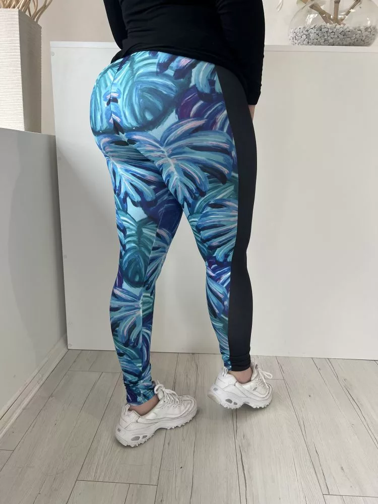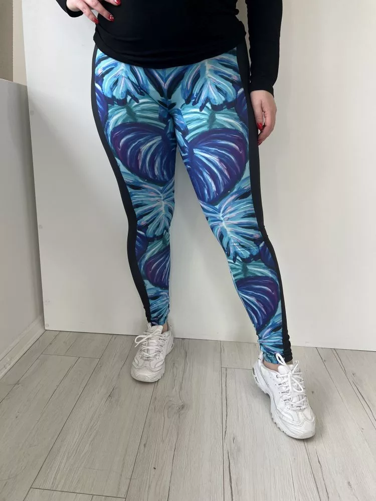 (XL) Fekete-Kék Levélmintás, Oldalt Fekete Csíkos Gumisderekú Nadrág