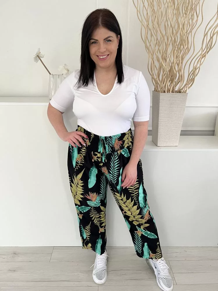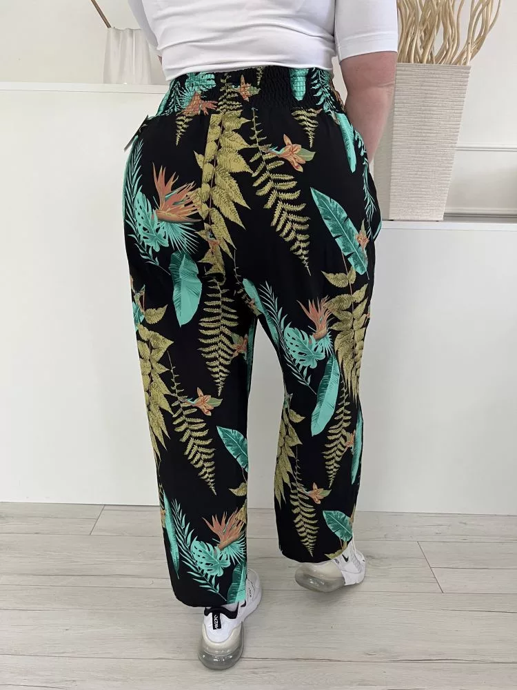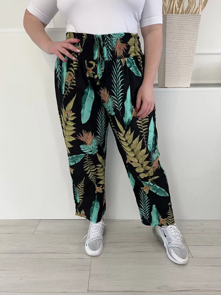 (XL) Fekete Zöld Levélmintás, Darázsolt Derekú Elől Díszmegkötős Nadrág