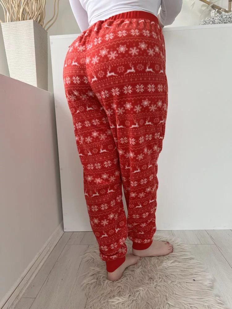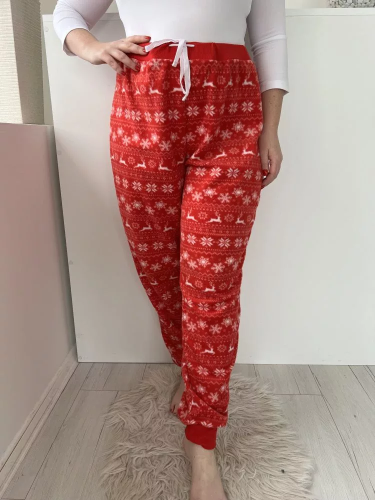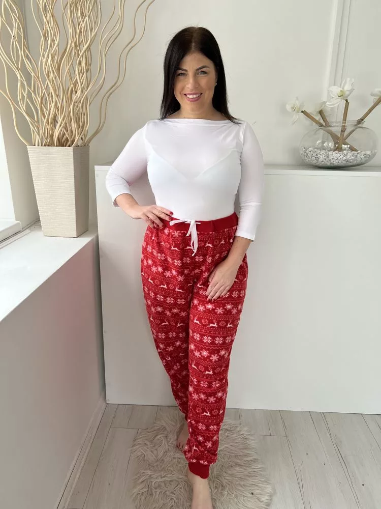 (XXL) Piros Fehér Hópehely és Rénszarvas Mintás Szőrös Alapanyagú, Pizsama Nadrág