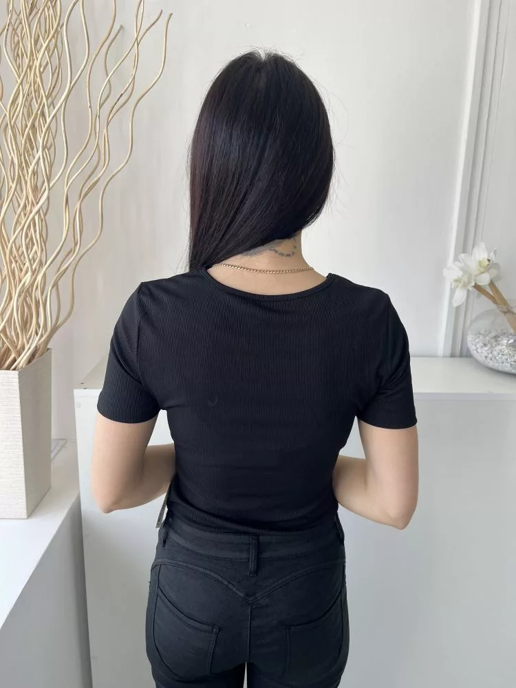 Yozy (M) Fekete Anyagában Bordázott, Mellnél Kivágott Kerek Nyakú, Rugalmas Anyagú Body