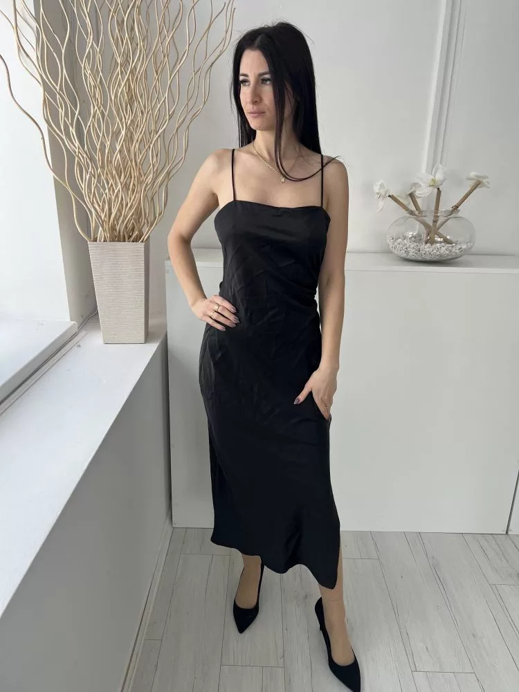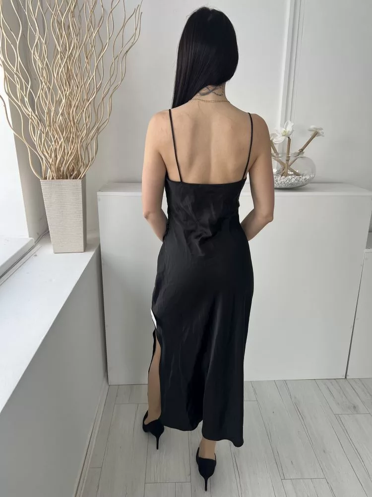 ZARA (M) Fekete Pántos, Oldalt Sliccelt Fényes Anyagú Ruha