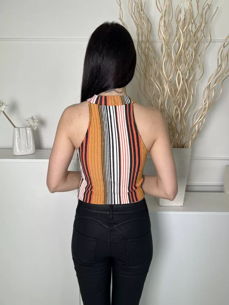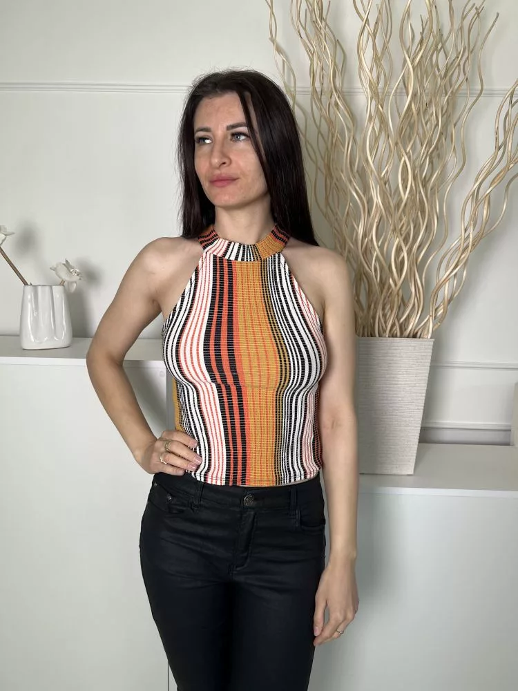ZARA (S) Fehér-Piros-Okker Csíkos, Nyakpántos Rugalmas Anyagú Felső