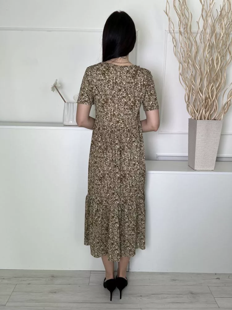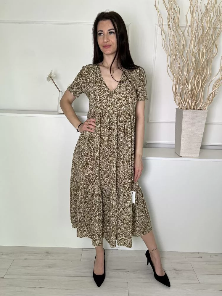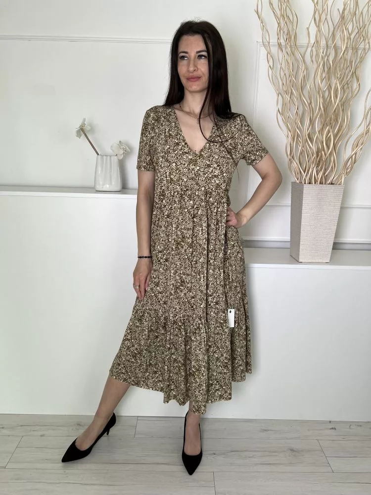 ZARA (S) Khaki Apró Drapp Virágos, V Kivágású Fodros Aljú Ruha