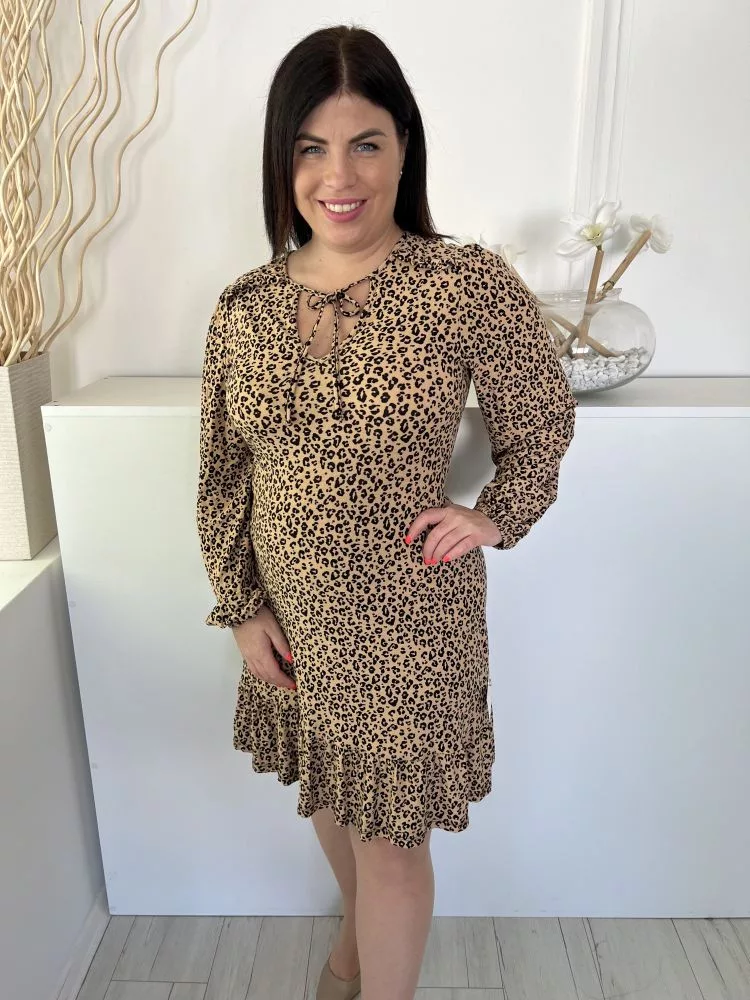 F&F (M) Barna Fekete Foltmintás Elöl Nyakban Megkötős, Fodros Ruha